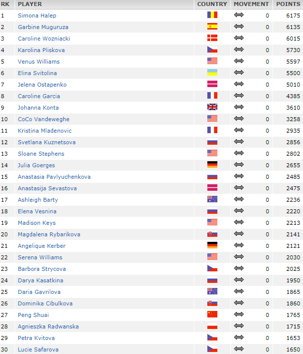 WTA Tek Kadınlar Dünya Klasmanı İlk 30: