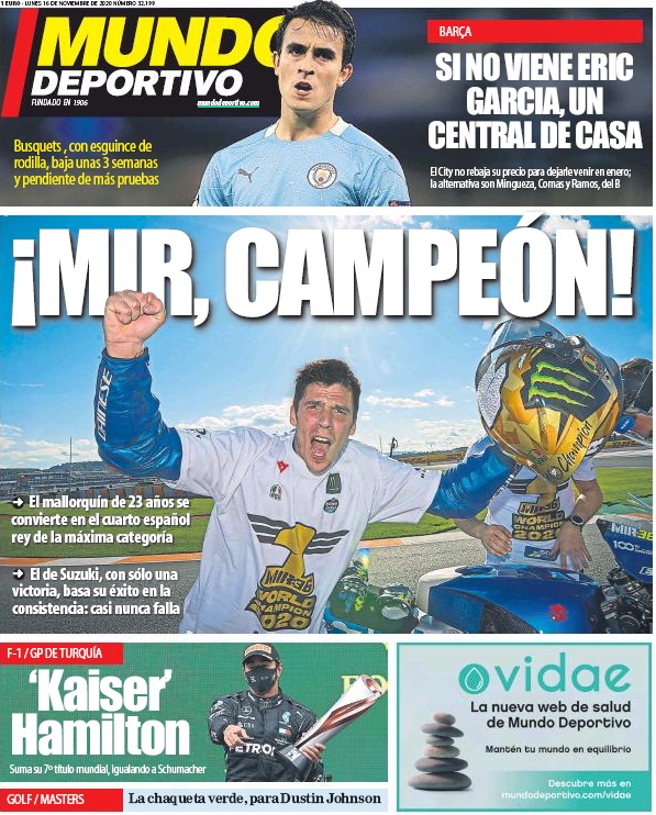 Mundo deportivo 'Mir şampiyon' manşeti altında 23 yaşındaki ispanyol pilot joan mir'in moto gp şampiyonu olarak yakaldığı başarıya vurgu yaparken, istanbulda fırtınalar koparan lewis hamilton içinse schumacherin rekoruna ortak olmasına atıfta bulunarak almanca imparator hamilton başlıgını atıyor.