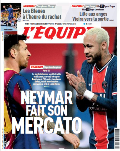 Fransız L'Equipe Gazetesi Messi ve Neymar'ın fotoğraflarının olduğu habere "Neymar transfer pazarına çıktı" başlığını attı. Gazete haberin detayında "Brezilyalı yıldız, PSG'nin Manchester United galibiyetinin ardından, gelecek sezon Lionel Messi ile birlikte oynamak istediğini açıklayarak kafa karışıklığı yarattı" ifadelerine yer verdi.