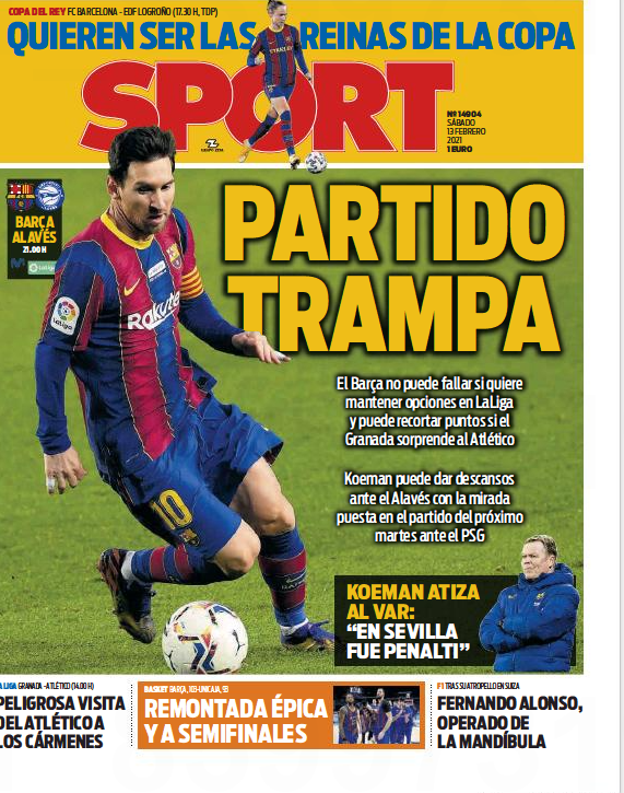 Sport gazetesi, Barcelona ile Deportivo Alaves arasında oynanacak mücadeleyi 'Tuzak Maç' manşetiyle gördü. Barcelona'nın bu kritik karşılaşmayı kazanarak PSG maçı öncesi moral depolamak istediği belirtildi.