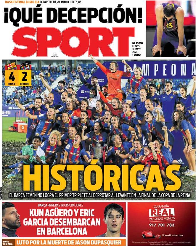 İspanyol Sport Gazetesi, bugünkü sayısında Barcelona Kadın Futbol Takımı'nın İspanya Kraliçe Kupası'nı da kazanarak tarihinde ilk kez üç kupayı birden müzesine götürmesini konu edinmiş.