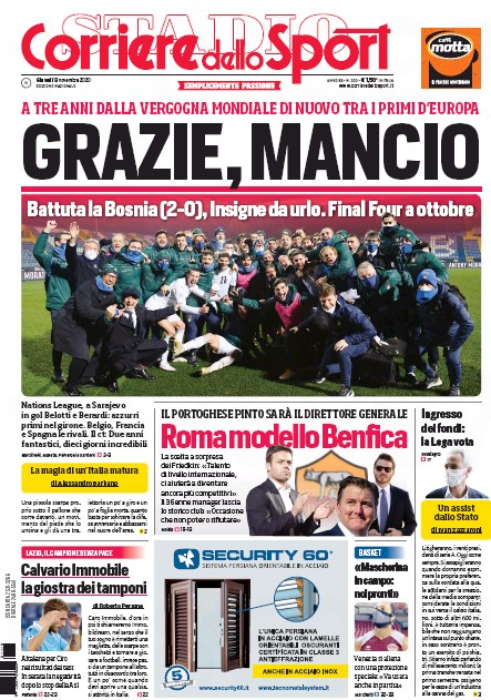 Corriere dello Sport, "Teşekkürler Mancini" başlığı ile İtalyan teknik adama minnetlerini iletirken, 3 yıl önce Dünya Kupası’na katılamadıkları dönemde yaşadıkları utançtan, Avrupa'nın önde gelen takımlarından birine dönüştüklerinin altını çiziyor.