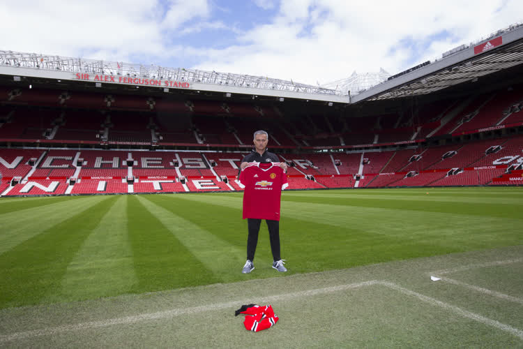 İngiltere Premier Lig ekiplerinden Manchester United ile 3 yıllık sözleşme imzalayan teknik direktör Jose Mourinho, İngiltere'nin Manchester kentindeki Old Trafford Stadı'nda basın mensuplarına poz verdi.