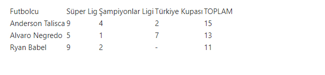 Ligdeki 24 maçta 46 gol atan siyah-beyazlı ekibin bu üçlüsü toplam 23 kez fileleri havalandırdı. Talisca, Babel ve Negredo, gollerin yüzde 50'sini atarak Beşiktaş'ı zirvenin içinde tuttu.